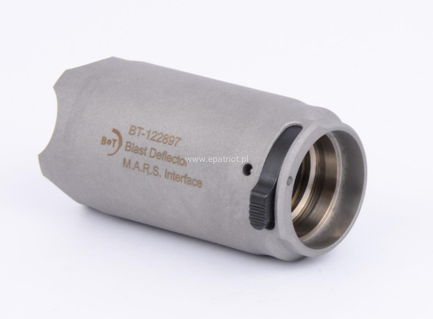 B&T Blast Deflector QDM™ z tłuczkiem do szyb pod .223 Rem + .308 Win M.A.R.S. FH - pomimo tego, że kompensatory jak i tłumiki płomienia są bardzo popularne posiadają pewne wady. Przykładowo podczas strzelania z pozycji leżącej na strzelnicy, podmuch wylotowy może podnieść kurz, brud czy nawet małe kamienie lub podmuch może . Bywa to czasem niekomfortowe dla strzelca, może blokować pole widzenia, a w skrajnych przypadkach powodowac zacięcia. Dlatego Blast Deflector od firmy B&T to idealne rozwiązanie. Wersja QDM jest przystosowana do montażu na tłumikach płomienia i kompensatorach w standardzie B&T M.A.R.S. (kal. .223/5,56mm lub .308/7,62mm) w mniej niż 5 sekund. Blast Deflector spowalnia gorące gazy opuszczające lufę i zapobiega dyspersji bocznej. Tym samym wszelkie zagrożenie dla sąsiednich strzelców, jak również nie podnosi kurzu i brudu podczas strzału. Ze względu na niewielka wagę, urzedzenie pomaga ograniczyć ruch lufy podczas strzelania, umożliwiając strzelcowi szybkie oddawanie kolejnych strzałów.