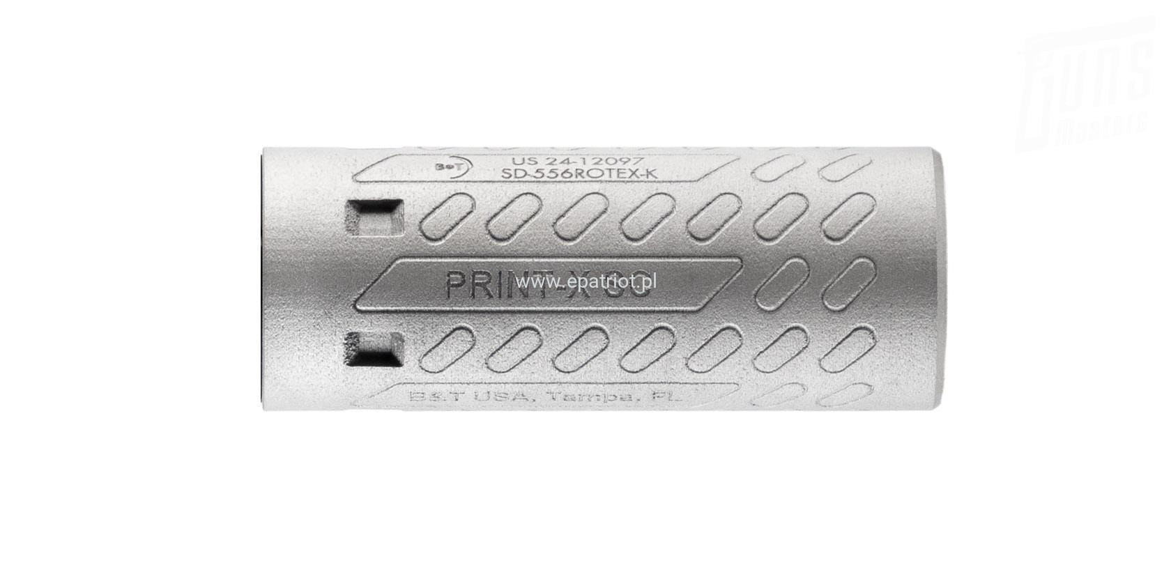 B&T Print-X Sub Compact TITAN kal. .223 Rem - hybrydowe urządzenie wylotowe klasy ROTEX, przeznaczone do broni kalibru .223 Rem, który został wykonany techniką laserowego łączenia warstw przy użyciu tytanu. Dzięki czemu tłumik jest bezspawowy, co zmniejsza wagę oraz punkty awarii, a zwiększa integralność strukturalną. To również optymalne rozwiązanie do redukcji dźwięku oraz płomienia wylotowego, który przetrwa intensywny trening strzelecki czy harmonogram strzelań. Tłumiki klasy Rotex zapewniają wyjątkowe możliwości tłumienia dźwięku, ekstremalną trwałość, a jednocześnie są lekkie, co prowadzi do minimalnych odchyleń punktu celowania/punktu uderzenia.Ten hybrydowy tłumik nadaje się do zastosowania w karabinkach o różnych długościach luf.