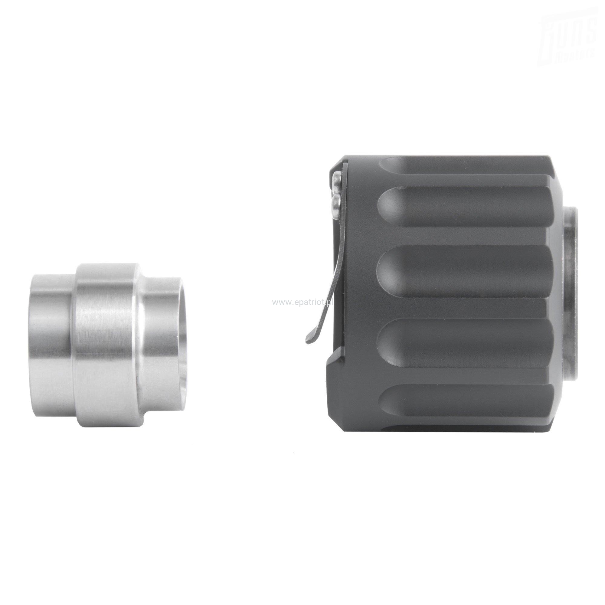 Konwersja pozwalająca przekształcić urządzenie wylotowe do MP9/TP9, na tłumik do montażu na broni kal. 9mm z zakończeniem lufy typu TRI-LUG. Przykładowo B&T APC9, GHM9 czy H&K MP5. Wystarczy odkręcić oryginalną nakrętkę mocującą i zastąpić ją nową nakrętką mocującą ze zintegrowaną tuleją prowadzącą.