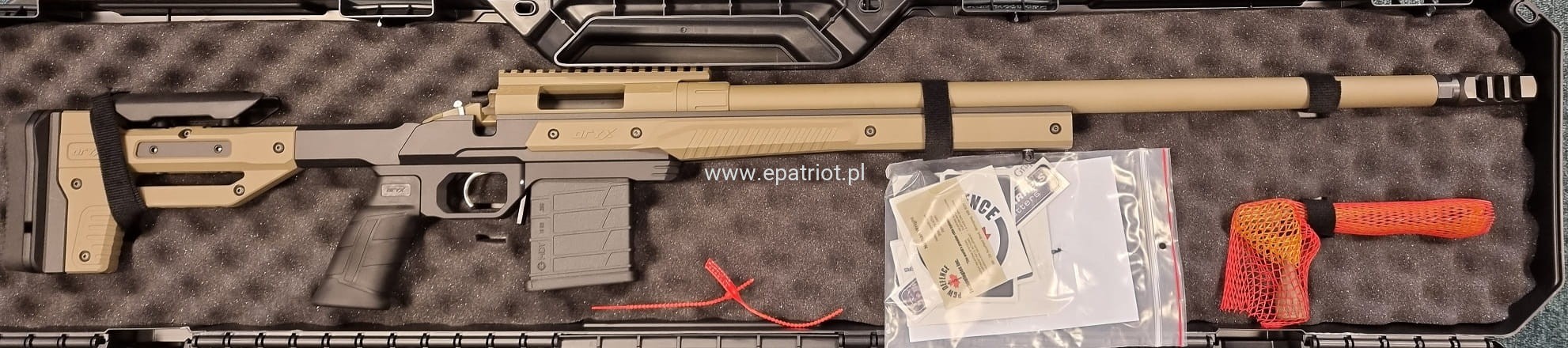 Zestaw zawiera karabin, hamulec wylotowy, dopasowaną twardą walizkę, wycior i zestaw do czyszczenia, 1 magazynek oraz instrukcję obsługi.