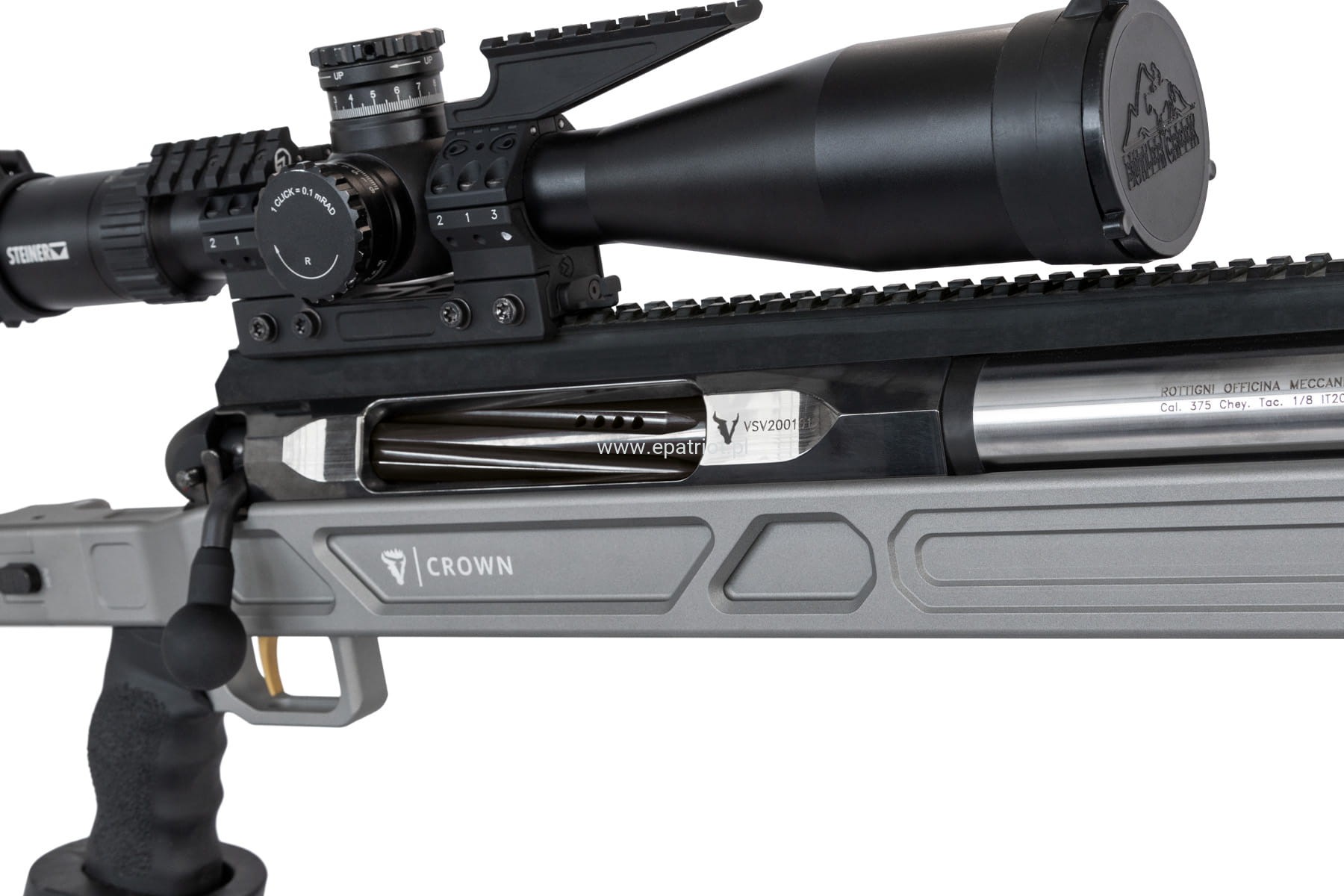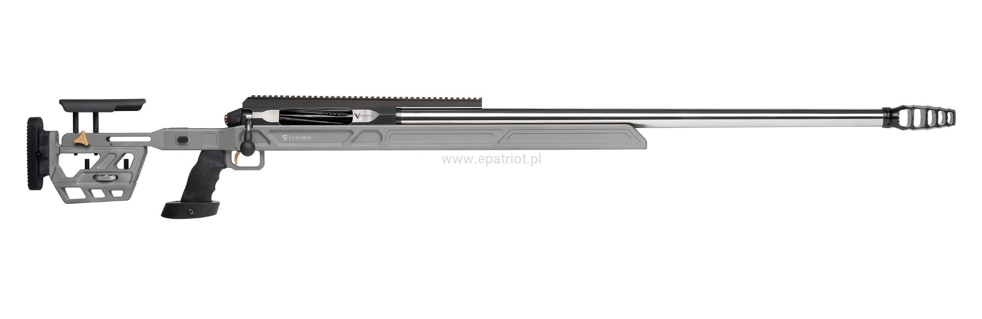 Karabin precyzyjny Victrix Crown V lufa 38" kal. .375 Cheytac to jednostrzałowa wyborowa broń znana z bardzo długiego zasięgu, precyzji oraz siły rażenia. Wykorzystywany jest głównie w celach militarnych, snajperskich i sportowych umożliwiając strzelanie na bardzo duże odległości, nawet do 2500 metrów. Posiada gwintowana docieraną lufę ze stali AISI 416R, kolbę z regulacją w poziomie i pionie, ergonomiczny i wymienny uchwyt, szynę dolną typu Anschutz do montażu dwójnogu, odłączany hamulec wylotowy Victrix ProAngle z pięcioma pochylonymi do przodu komorami, precyzyjny spust Victrix Sporting Plus z dwupozycyjnym górnym zabezpieczeniem i złotym wykończeniem ustawiony standardowo na ok. 500 gr. W zestawie również znajdziemy instrukcję obsługi i zestaw powitalny.
