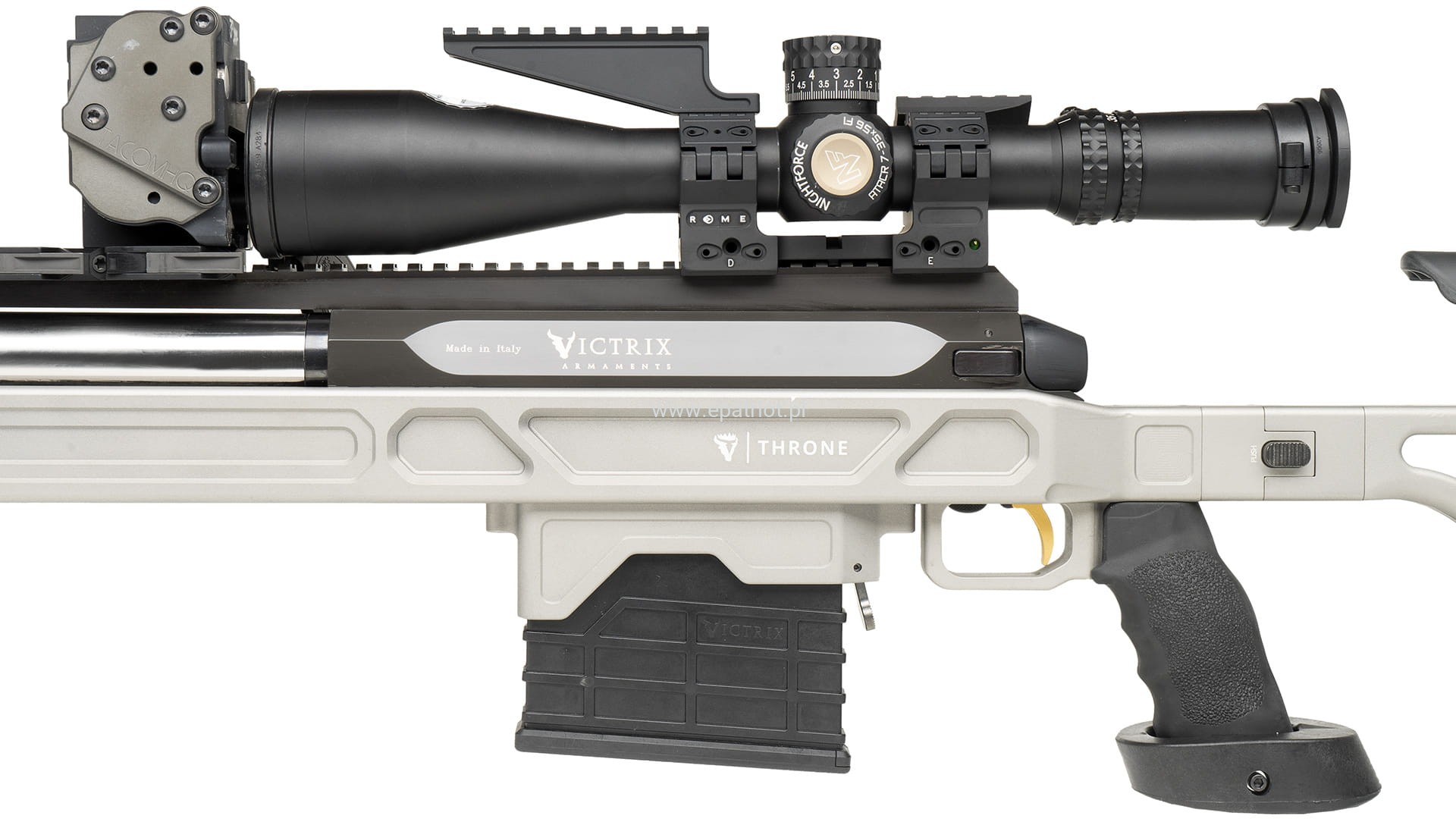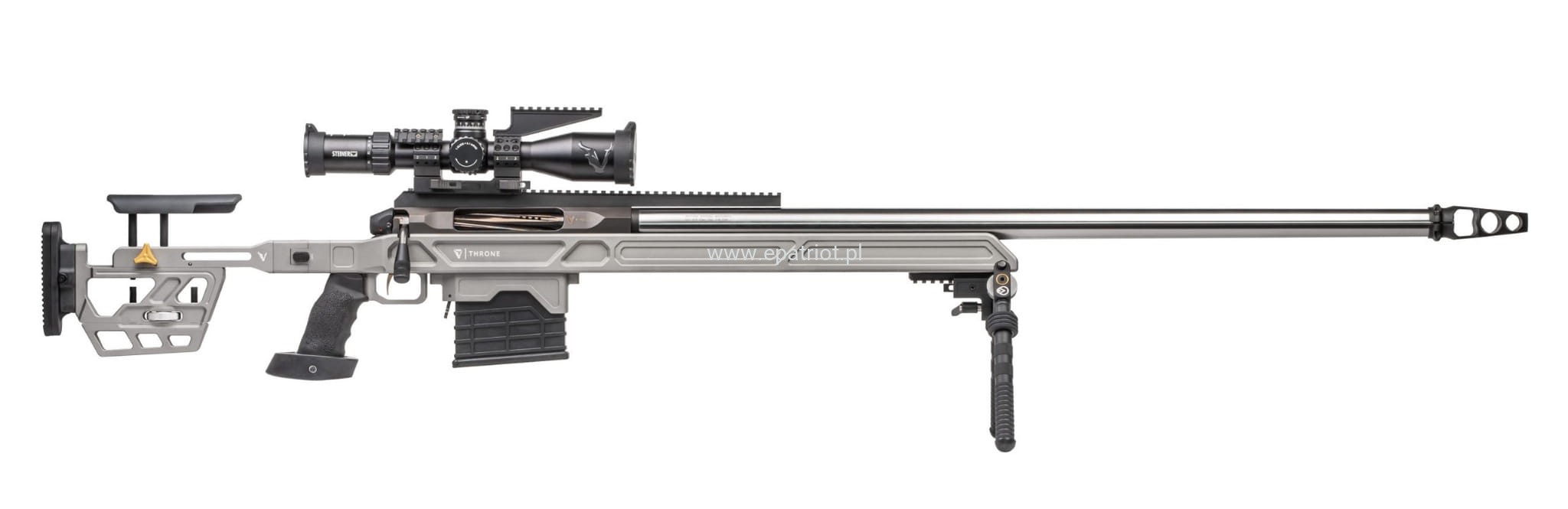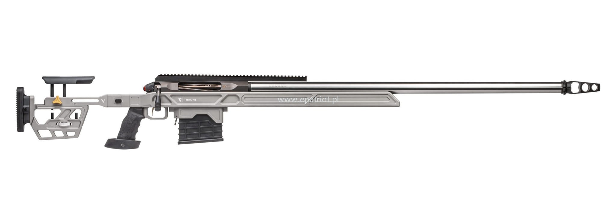 Karabin precyzyjny Victrix Throne V lufa 38" kal. .375 Cheytac to wyborowa broń znana z bardzo długiego zasięgu, precyzji oraz siły rażenia. Wykorzystywany jest głównie w celach militarnych, snajperskich i sportowych umożliwiając strzelanie na bardzo duże odległości, nawet do 2500 metrów. Posiada gwintowana docieraną lufę ze stali AISI 416R, kolbę z regulacją w poziomie i pionie oraz ocieplana część policzkowa, ergonomiczny i wymienny uchwyt, szynę dolną typu Anschutz do montażu dwójnogu, odłączany hamulec wylotowy Victrix ProAngle z trzema pochylonymi do przodu komorami, precyzyjny spust Victrix Sporting Plus z dwupozycyjnym górnym zabezpieczeniem i złotym wykończeniem ustawiony standardowo na ok. 500 gr. W zestawie również znajdziemy instrukcję obsługi i zestaw powitalny.