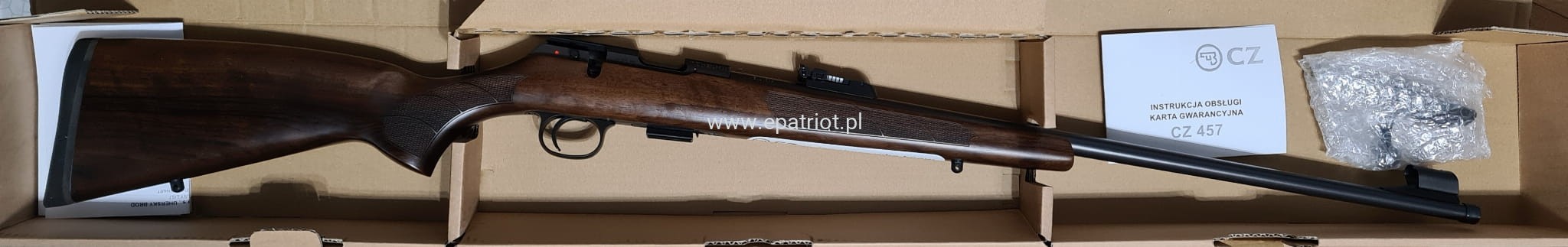Karabinek CZ 457 LUX kal. 22LR to matchowy karabinek bocznego zapłonu o myśliwskiej stylistyce, ze stylowym orzechowym łożem, lufą o długości 630 mm, nowym mechanizmem spustowym oraz wskaźnikiem napiętej iglicy. Długa lufa o standardowym przekroju i długości 63 cm, oferuje wiekszą prędkość wylotową pocisku. Wyposażona w regulowane otwarte przyrządy optyczne, pozwala na oddawanie dalekich, celnych strzałów nawet bez zamontowanej lunety celowniczej. Język spustowy z regulacją siły nacisku. Magazynek w wersji pudełkowej, mieszczący 5 sztuk amunicji.