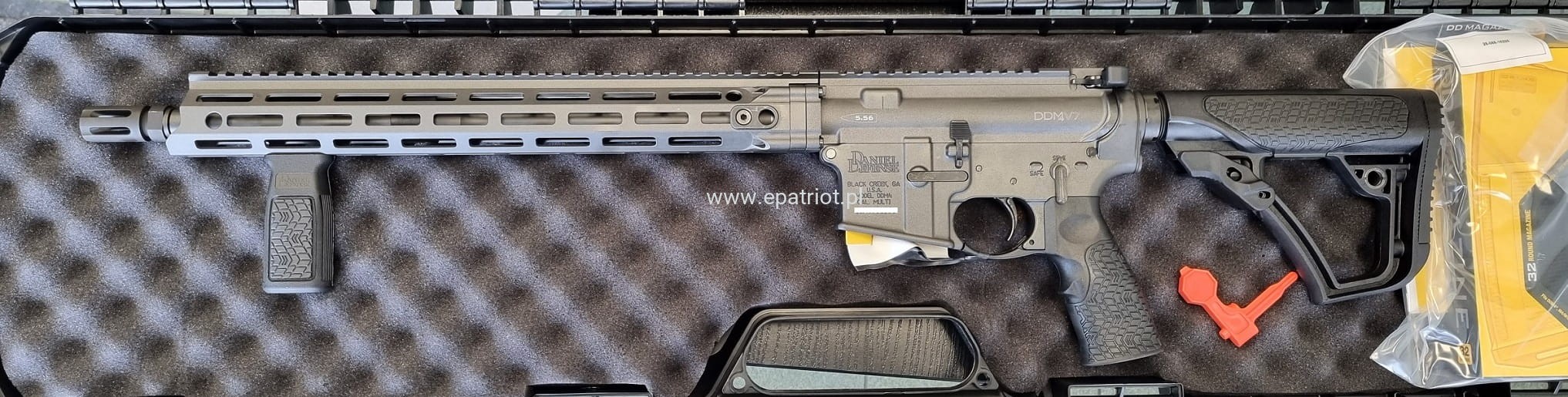 Zestaw zawiera: Karabinek Daniel Defesne V7, pionowy chwyt przedni, 32 nabojowy magazynek produkcji DD, polimerową sygnowany futerał na broń, dodatkową poszerzoną stopkę kolby.