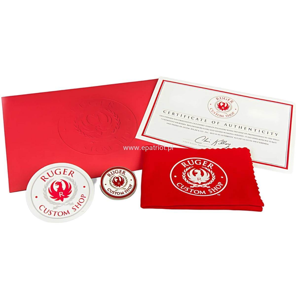 - W zestawie: twardy futerał, Certyfikat autentyczności Ruger Custom Shop®, moneta Custom Shop, ściereczka do czyszczenia i naklejka.