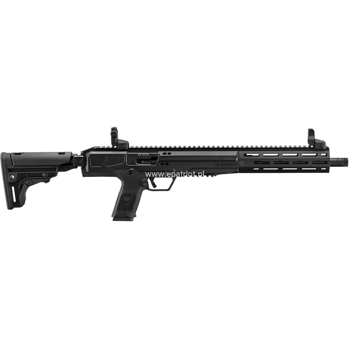 - W pełni regulowane, składane przyrządy celownicze Ruger® Rapid Deploy. Górna szyna Picatinny umożliwiająca montaż optyki lub kolimatora.