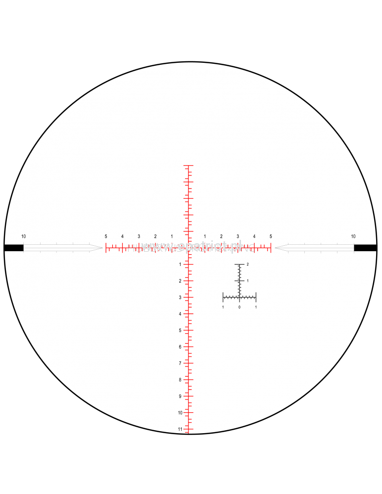 - Krzyż: MIL-C, w pierwszym planie, podświetlany, system DigiIlum (dwa kolory podświetlenia: czerwony i zielony), podziałka 1.0Mil w poziomie i 15Mil w dół.