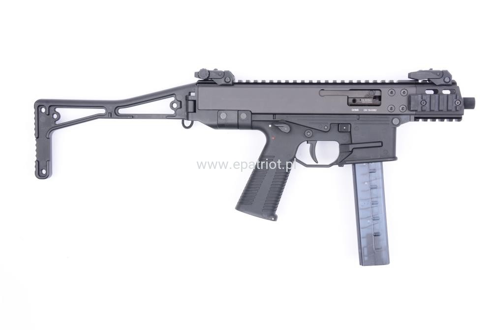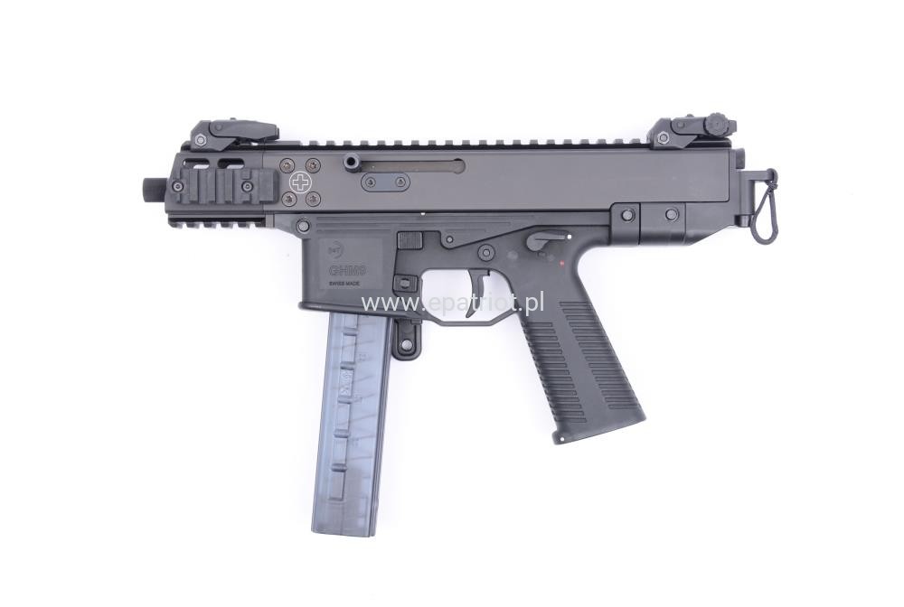 Pistolet B&T GHM9 COMPACT 4,4" 9x19mm intuicyjna ergonomia wraz z wyraźnym spustem sprawiają, że jest to doskonały wybór do dynamicznych zawodów strzeleckich. Posiada wiele tych samych cech co popularny APC9, dodatkowo zapewniając użytkownikowi elastyczność i modułowość. Model COMPACT został wyposażony w kutą na zimno lufę o długości 4,4'', na której końcu, pod osłoną znajduje się gwint 1/2''-28 UNEF. Znacznie zwiększa to możliwość konfiguracji broni przez użytkownika. Cały system działa na zasadzie odrzutu zamka swobodnego. Posiada również hudrauliczny buffer, który zmniejsza odrzut oraz wydłuża żywotność samej broni. U góry znajdziemy długą szyne NAR, tak samo jak u dołu łoża. Natomiast boczne ściany łoża zostały wyposażone w pojedyńcze sekcje systemu M-LOK.