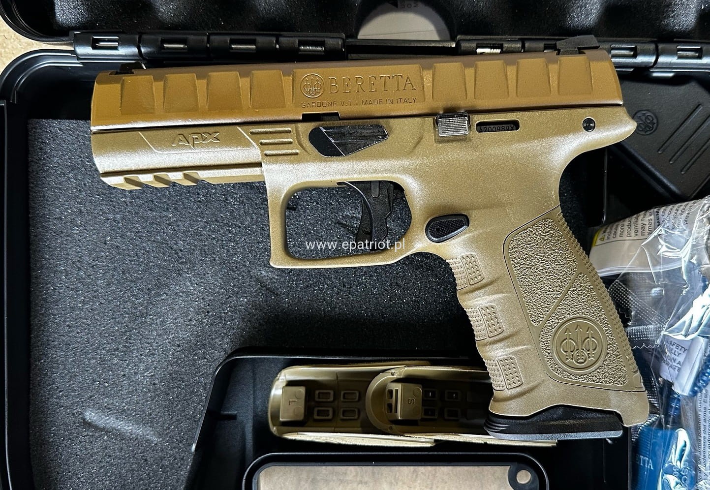 Pistolet Beretta APX FDE kal. 9x19 mm to nowoczesna modułowa konstrukcja broni wyróżniająca się niewielkim odrzutem, niezawodnością oraz ergonomią. Posiada wymienne okładziny chwytu, żebrowanie zamka co znacznie ułatwia manipulowanie, nisko położona oś lufy, stalowe przyrządy celownicze oraz szynę Picatinny do montażu akcesoriów.