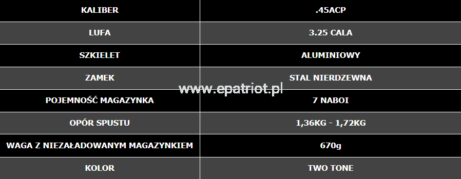 Szkielet wykonany jest zgodnie z parametrami technicznymi modelu 1911 serii 70, który cechuje brak blokady iglicy.
