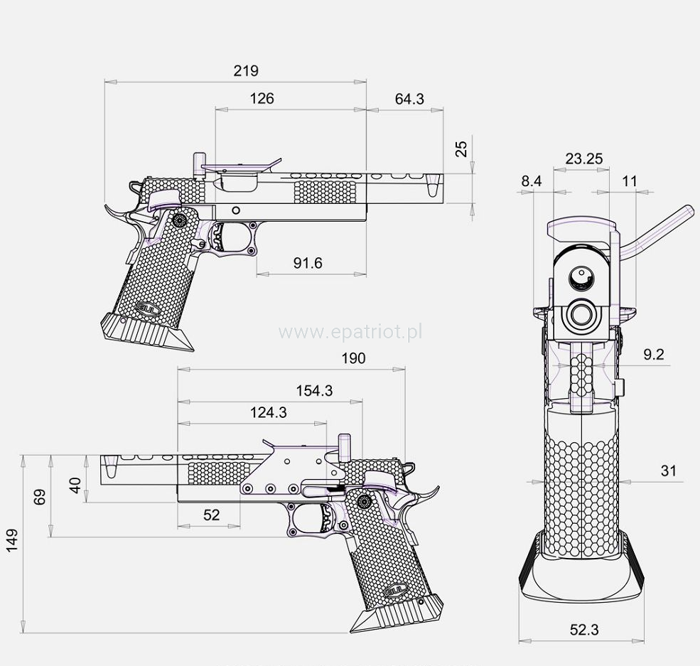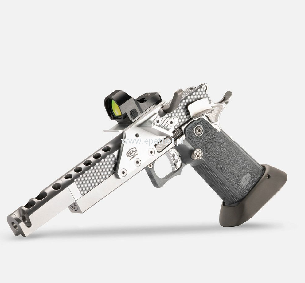Pistolet ma unikalną na skalę światową jednoczęściową hybrydową lufę 5,7" z kompensatorem, która zwiększa wagę, zapewniając maksymalną stabilność podczas strzelania. Zamek wykonany ze stali nierdzewnej posiada estetyczne nacięcia, które nie tylko świetnie się prezentują, ale dodatkowo go odciążają. Zaczep spustowy, kurek i przerywacz są maszynowo obrabiane zgodnie z najwyższymi światowymi standardami, zapewniając doskonałą pracę na spuście. Pistolet został wyposażony w zupełnie nowy aluminiowy spust z możliwością zmiany profilu języka spustowego na okrągły lub płaski. Ponadto jest dostępny w trzech różnych rozmiarach i kolorach.