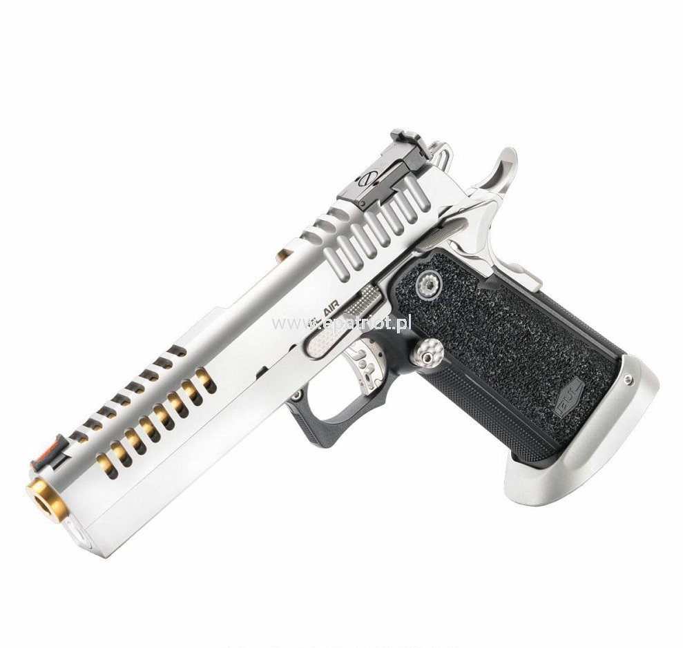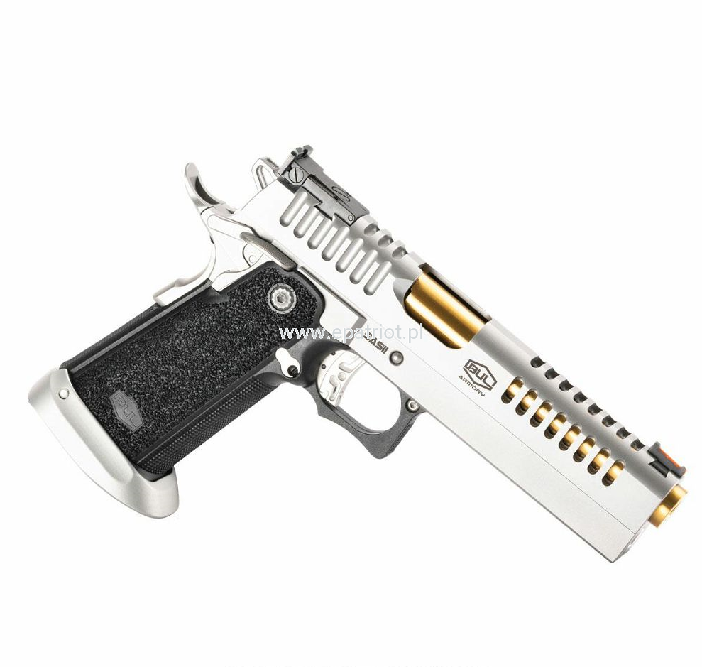 Pistolet Bul Armory SAS II SL AIR kal. .40S&W - linia SAS II to najnowsze wyczynowe pistolety, opracowane na podstawie wieloletnich doświadczeń światowej klasy zawodników IPSC z TEAM BUL, produkowane pod marką BUL LTD. Wszystkie modele SAS są standardowo wyposażone w takie elementy jak żerdź o pełnej długości, obniżony i spłaszczony zrzut magazynka, kurek "match grade" i wiele innych dodatków w zależności od modelu. Polimerowe okładziny zostały przeprojektowany tak, aby pistolet zapewniał pewny i komfortowy chwyt. W połączeniu z agresywnymi nacięciami na zamku, pistolet zapewnia doskonałą ergonomie przy strzelaniu dynamicznym.