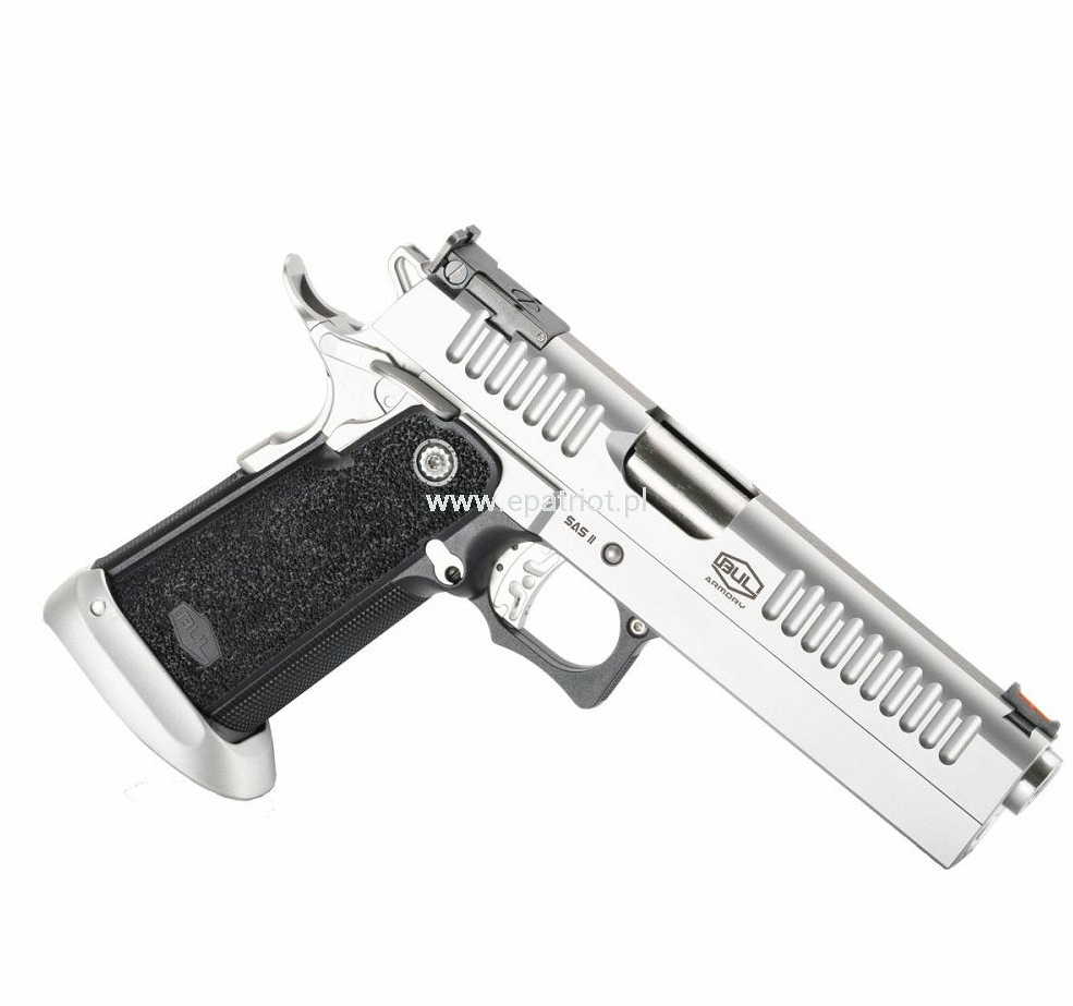 Pistolet Bul Armory SAS II SL kal. .40S&W - linia SAS II to najnowsze wyczynowe pistolety, opracowane na podstawie wieloletnich doświadczeń światowej klasy zawodników IPSC z TEAM BUL, produkowane pod marką BUL LTD. Wszystkie modele SAS są standardowo wyposażone w takie elementy jak żerdź o pełnej długości, obniżony i spłaszczony zrzut magazynka, kurek "match grade" i wiele innych dodatków w zależności od modelu. Polimerowe okładziny zostały przeprojektowany tak, aby pistolet zapewniał pewny i komfortowy chwyt. W połączeniu z agresywnymi nacięciami na zamku, pistolet zapewnia doskonałą ergonomie przy strzelaniu dynamicznym.