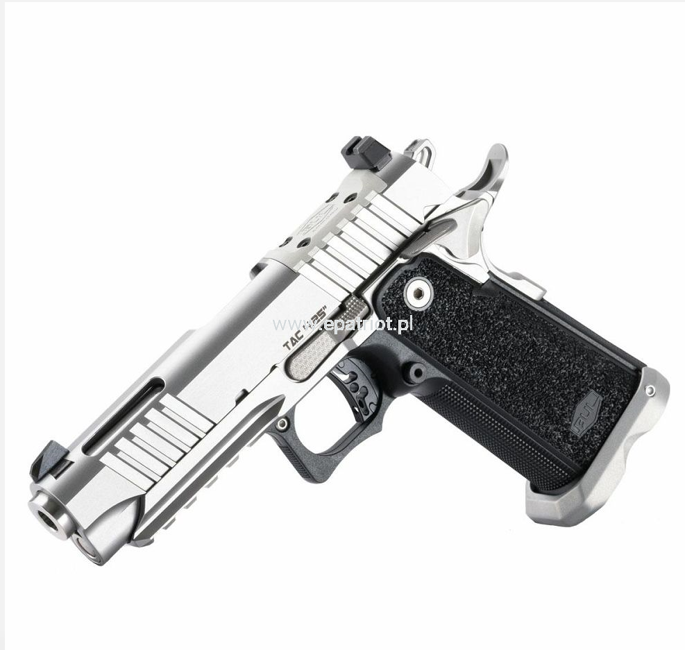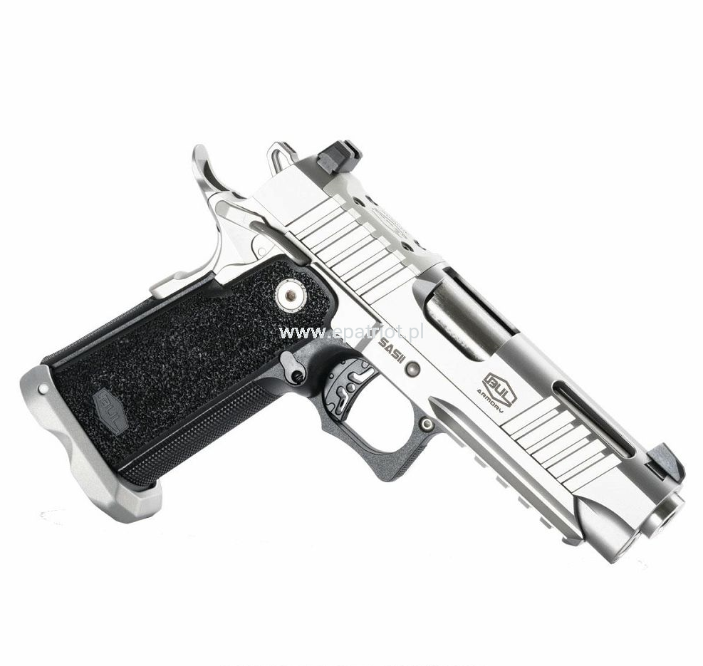 Pistolet Bul Armory SAS II TAC 4.25 OR kal. 9x19 / kolor srebrny - Optics Ready - linia SAS II to najnowsze wyczynowe pistolety, opracowane na podstawie wieloletnich doświadczeń światowej klasy zawodników IPSC z TEAM BUL, produkowane pod marką BUL LTD. Wszystkie modele SAS są standardowo wyposażone w takie elementy jak żerdź o pełnej długości, modułowy spust, duże chywty przeznaczone do 2 rzędowych magazynków, kurek "match grade" i wiele innych dodatków w zależności od modelu. Przeprojektowany polimerowy chwyt zapewnia pewne i wygodne trzymanie. W połączeniu z agresywnymi nacięciami na zamku, pistolet zapewnia doskonałą ergonomie przy strzelaniu dynamicznym.