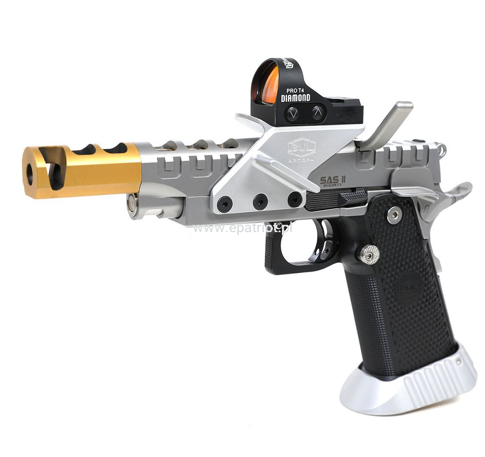 Pistolet Bul Armory SAS II UR SHORTY kal. 9x19 - linia SAS II to najnowsze wyczynowe pistolety, opracowane na podstawie wieloletnich doświadczeń światowej klasy zawodników IPSC z TEAM BUL, produkowane pod marką BUL LTD. Wszystkie modele SAS są standardowo wyposażone w takie elementy jak żerdź o pełnej długości, obniżony i spłaszczony zrzut magazynka, kurek "match grade" i wiele innych dodatków w zależności od modelu. Polimerowe okładziny zostały przeprojektowany tak, aby pistolet zapewniał pewny i komfortowy chwyt. W połączeniu z agresywnymi nacięciami na zamku, pistolet zapewnia doskonałą ergonomie przy strzelaniu dynamicznym.