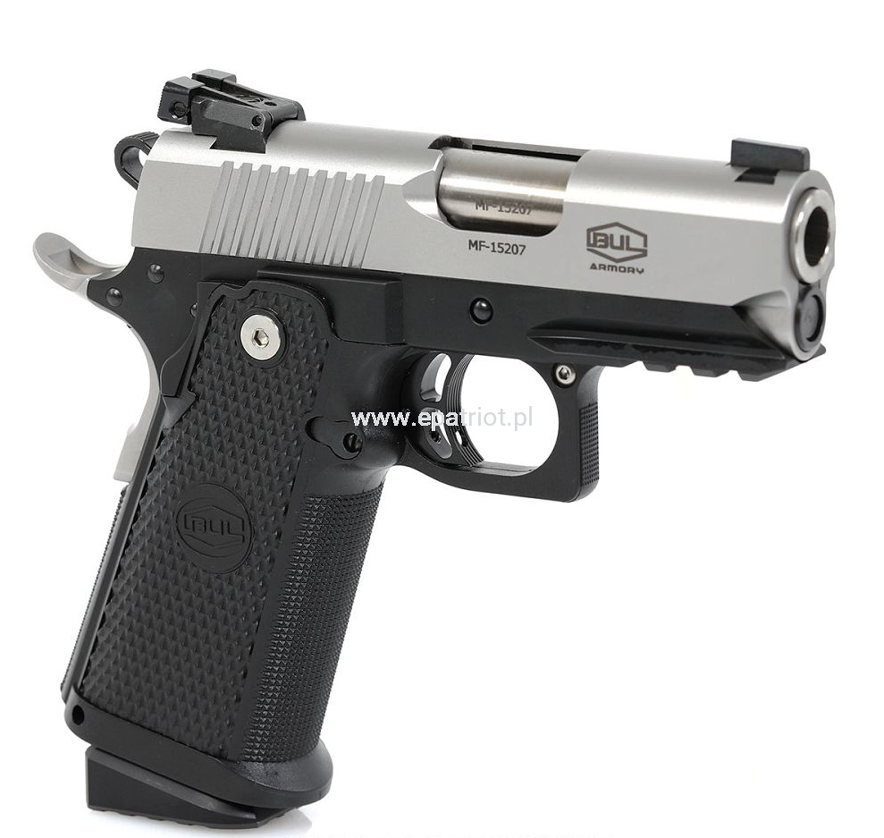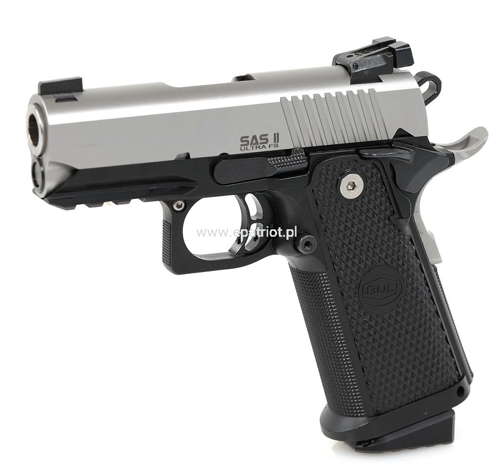 Pistolet Bul SAS II ULTRA Two Tone Reverse kal.45ACP - linia SAS II to najnowsze wyczynowe pistolety, opracowane na podstawie wieloletnich doświadczeń światowej klasy zawodników IPSC z TEAM BUL, produkowane pod marką BUL LTD. Wszystkie modele SAS są standardowo wyposażone w takie elementy jak żerdź o pełnej długości, obniżony i spłaszczony zrzut magazynka, kurek "match grade" i wiele innych dodatków w zależności od modelu. Polimerowe okładziny zostały przeprojektowany tak, aby pistolet zapewniał pewny i komfortowy chwyt. W połączeniu z agresywnymi nacięciami na zamku, pistolet zapewnia doskonałą ergonomie przy strzelaniu dynamicznym.