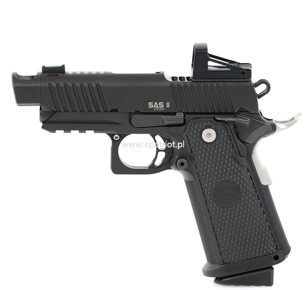 Pistolet Bul SAS II ULTRA VIPER kal. 9x19mm - linia SAS II to najnowsze wyczynowe pistolety, opracowane na podstawie wieloletnich doświadczeń światowej klasy zawodników IPSC z TEAM BUL, produkowane pod marką BUL LTD. Wszystkie modele SAS są standardowo wyposażone w takie elementy jak żerdź o pełnej długości, obniżony i spłaszczony zrzut magazynka, kurek "match grade" i wiele innych dodatków w zależności od modelu. Polimerowe okładziny zostały przeprojektowany tak, aby pistolet zapewniał pewny i komfortowy chwyt. W połączeniu z agresywnymi nacięciami na zamku, pistolet zapewnia doskonałą ergonomie przy strzelaniu dynamicznym.