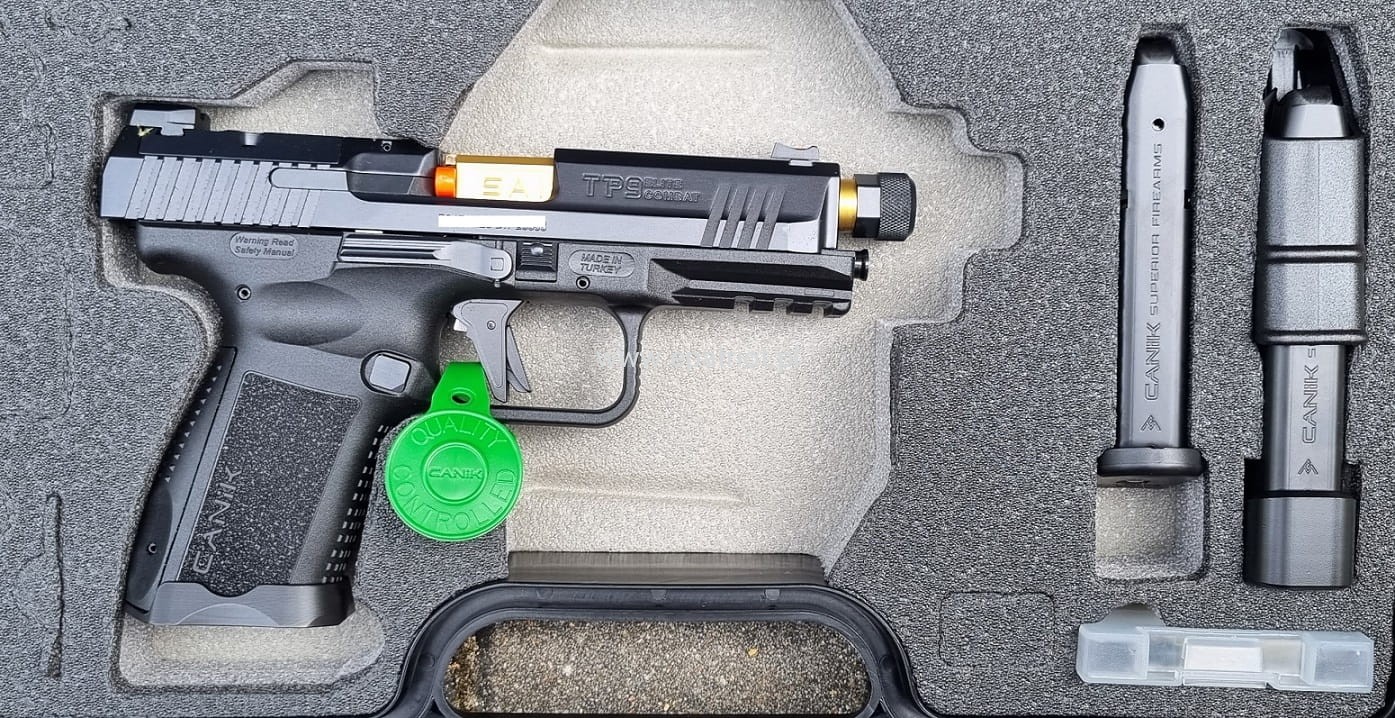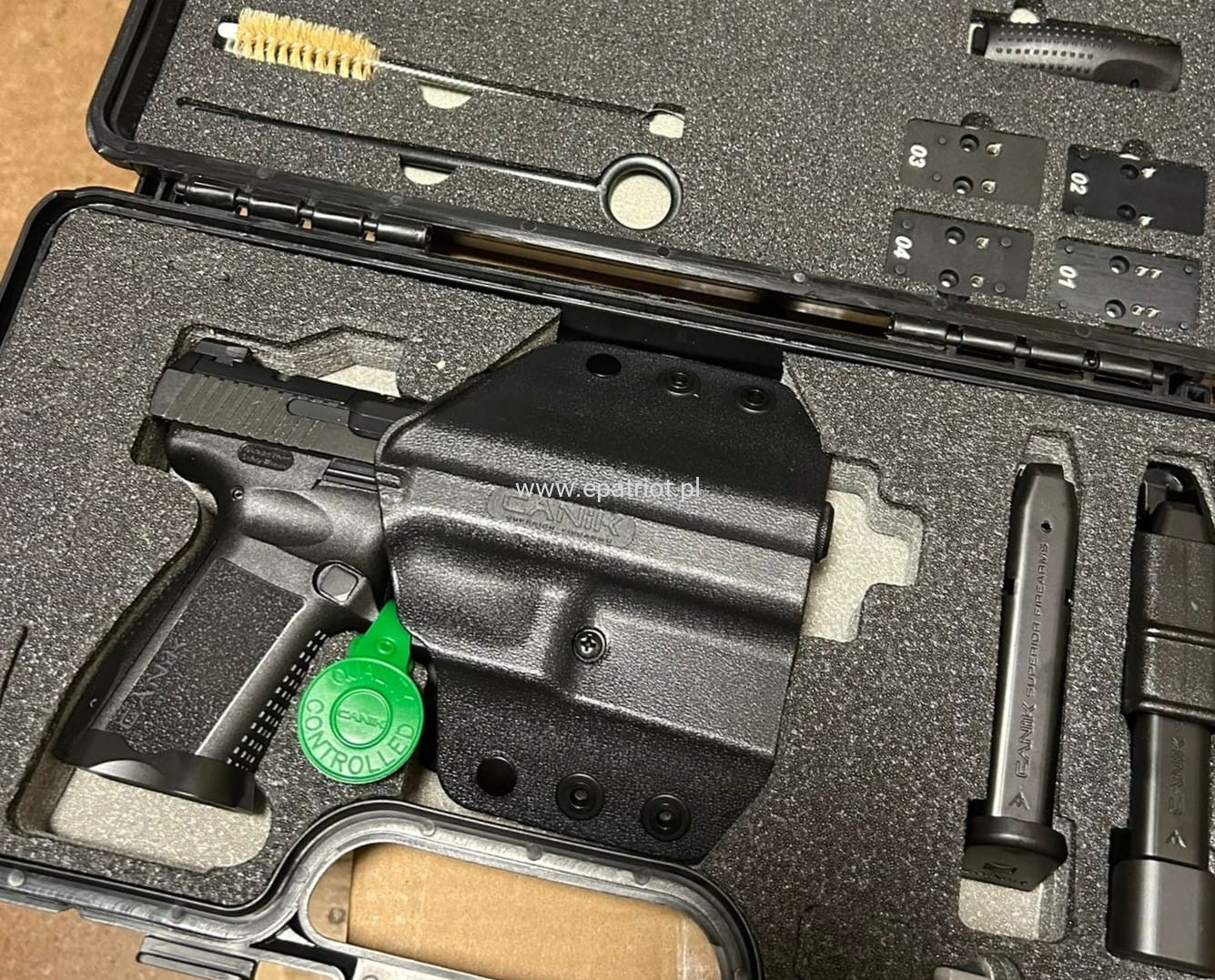 Pistolet Canik TP9 ELITE COMBAT EXECUTIVE Black kal. 9x19mm w zestawie z walizką, dwoma magazynkami, kaburą, trzema wymiennymi przyciskami zrzutu magazynka w trzech rozmiarach, cztery płytki pod kolimator, szybko ładowarka, zestaw do czyszczenia oraz okładziną chwytu.