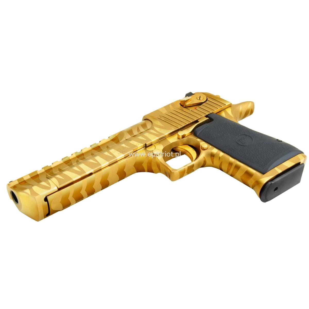 Pistolet Desert Eagle XIX 6'' Titanium Gold Tiger Stripes .44Magnum DE44TG-TS to słynny na całym świecie pistolet Desert Eagle z wykończeniem w Złote Tygrysie Paski (Gold Tiger Stripes) zaprojektowany w 1979 roku przez amerykańska firmę Magnum Research, Inc.