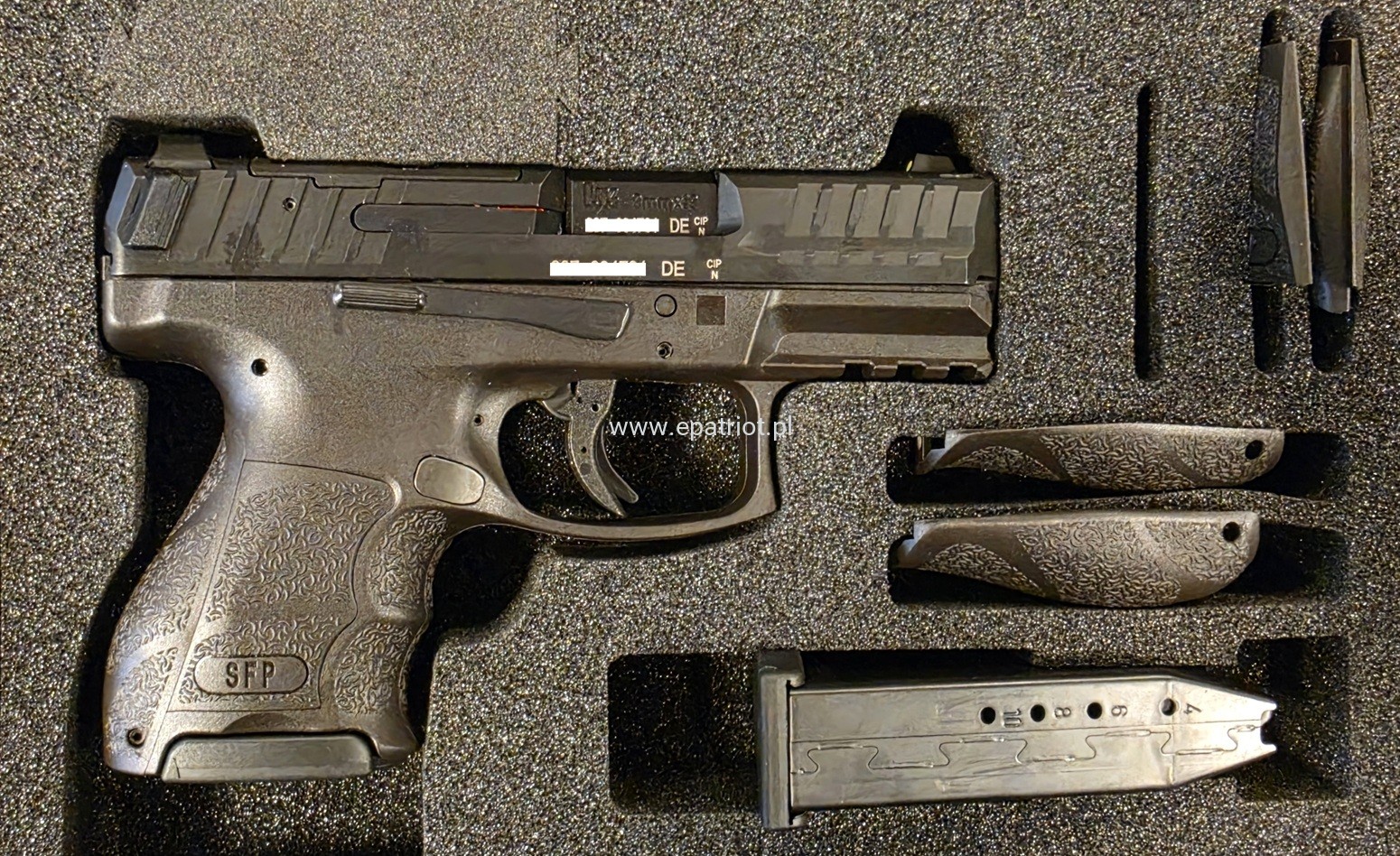 Oznaczenie SK (Subkompakt) wskazuje na najmniejszą wersję w rodzinie SFP9, co przekłada się na krótszą lufę, zmniejszoną rękojeść i łatwość ukrycia broni. Wariant SF (Special Forces) odnosi się do spustu o zoptymalizowanej charakterystyce – zapewniającego krótszą drogę i wyraźny reset, co poprawia kontrolę nad oddawanymi strzałami. OR (Optics Ready) oznacza przystosowanie zamka do montażu celownika kolimatorowego, natomiast PB (Push Button) wskazuje na klasyczny przyciskowy zwalniacz magazynka zamiast charakterystycznych dla HK „łopatek”.