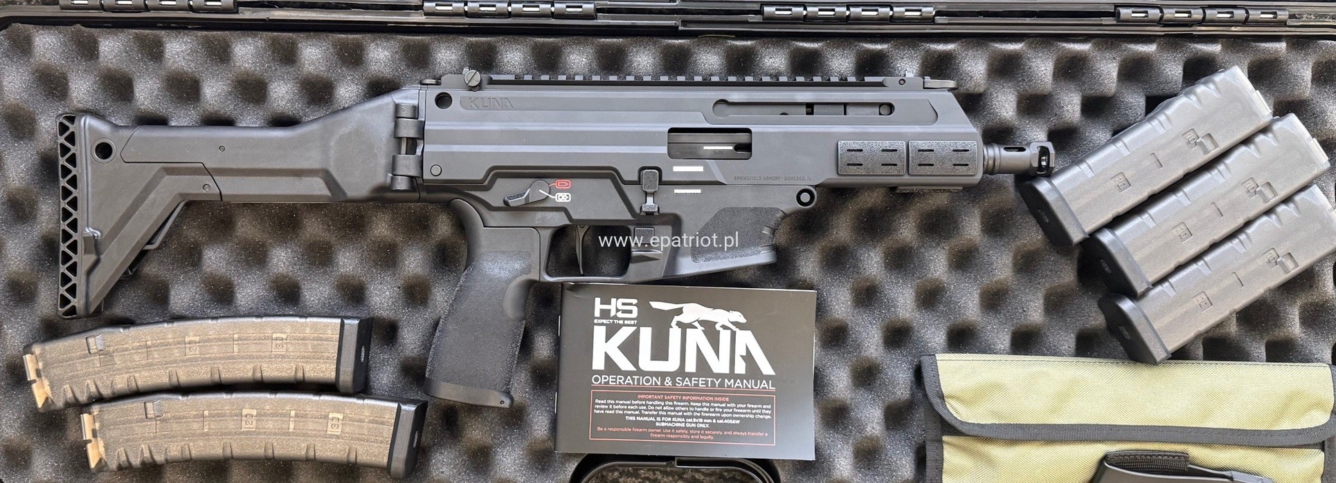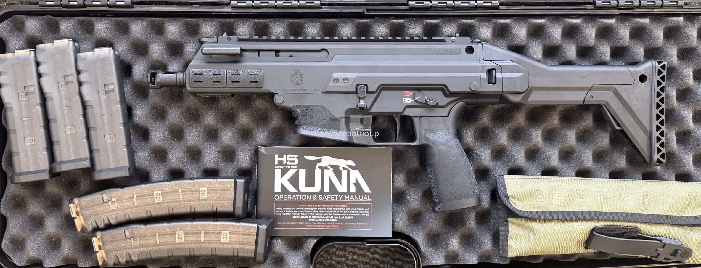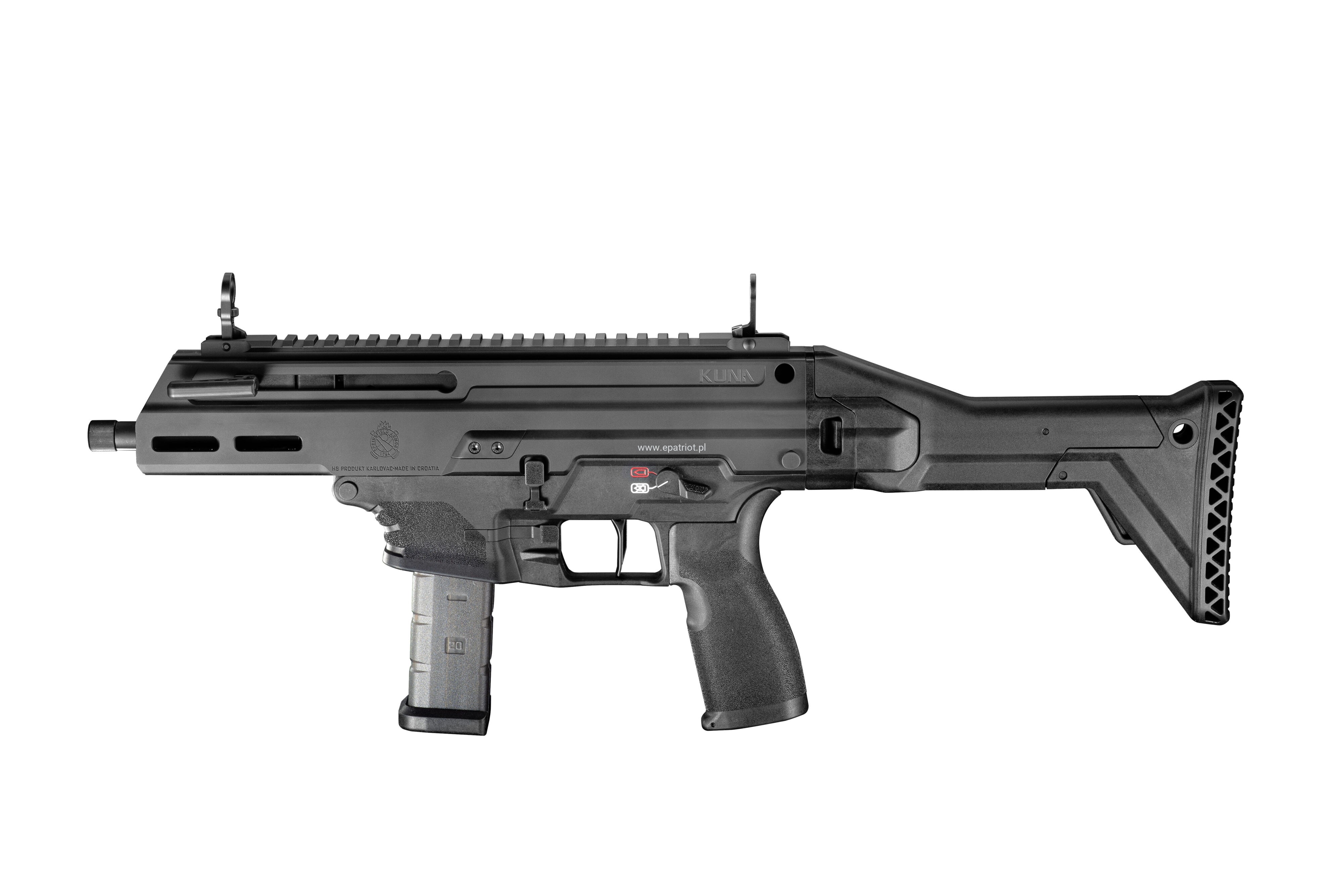 Pistolet KUNA lufa 5,5" kal. 9x19mm zaprojektowany z myślą o wyjątkowej stabilności strzelania w poręcznej obudowie. Kuna wyposażona jest w system opóźnionego startu z rolką, który radykalnie redukuje odczuwalny odrzut i poprawia kontrolę. Posiada wielopunktowy hamulec wylotowy, hybrydowe przyrządy celownicze typu flip-up oraz pięć przezroczystych magazynków z metalowymi wpustami, zapewniający niezawodne działanie. Dodatkowo wyposażony w pełni obustronne manipulatory, dźwignię przeładowania która zapewnia płynną i wygodną obsługę oraz regulowana kolbę która zapewnia indywidualne dopasowanie i większą kontrolę.