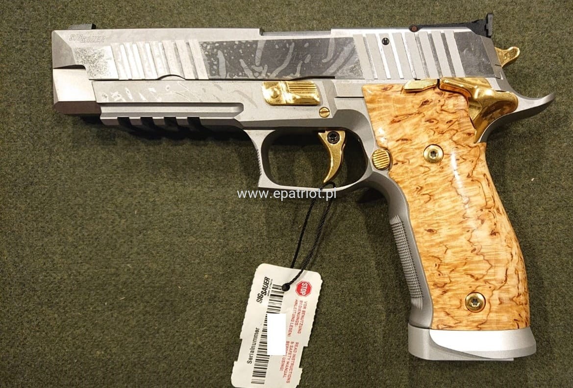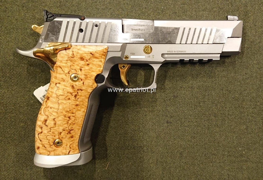 Pistolet Sig Sauer P226 X-Five Scandic kal. 9x19mm to marzenie kolekcjonerów zrobiony ze stali nierdzewnej ze złotymi akcentami i elementami z laminowanego drewna.