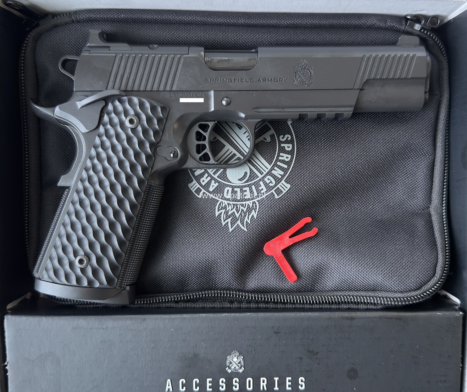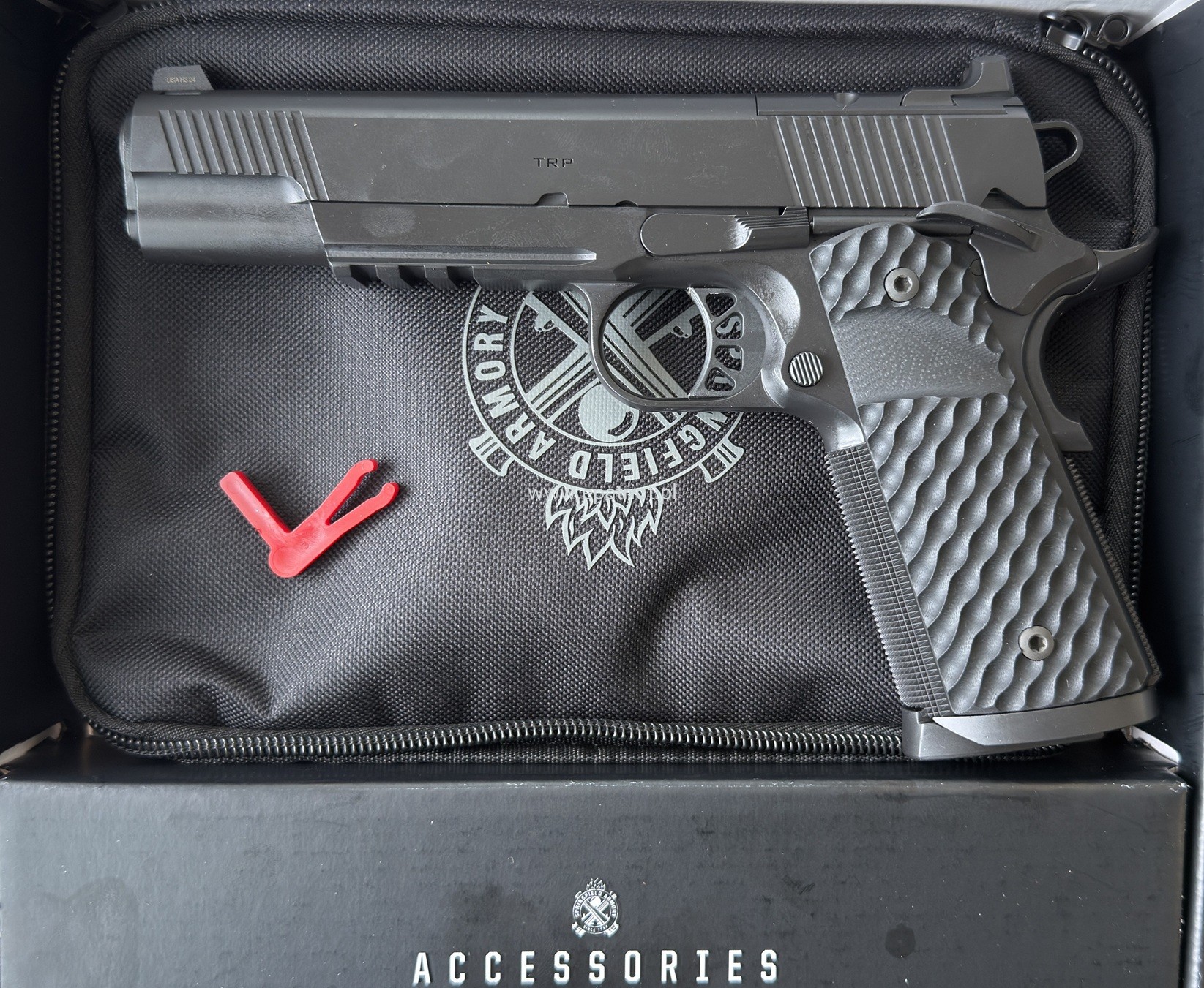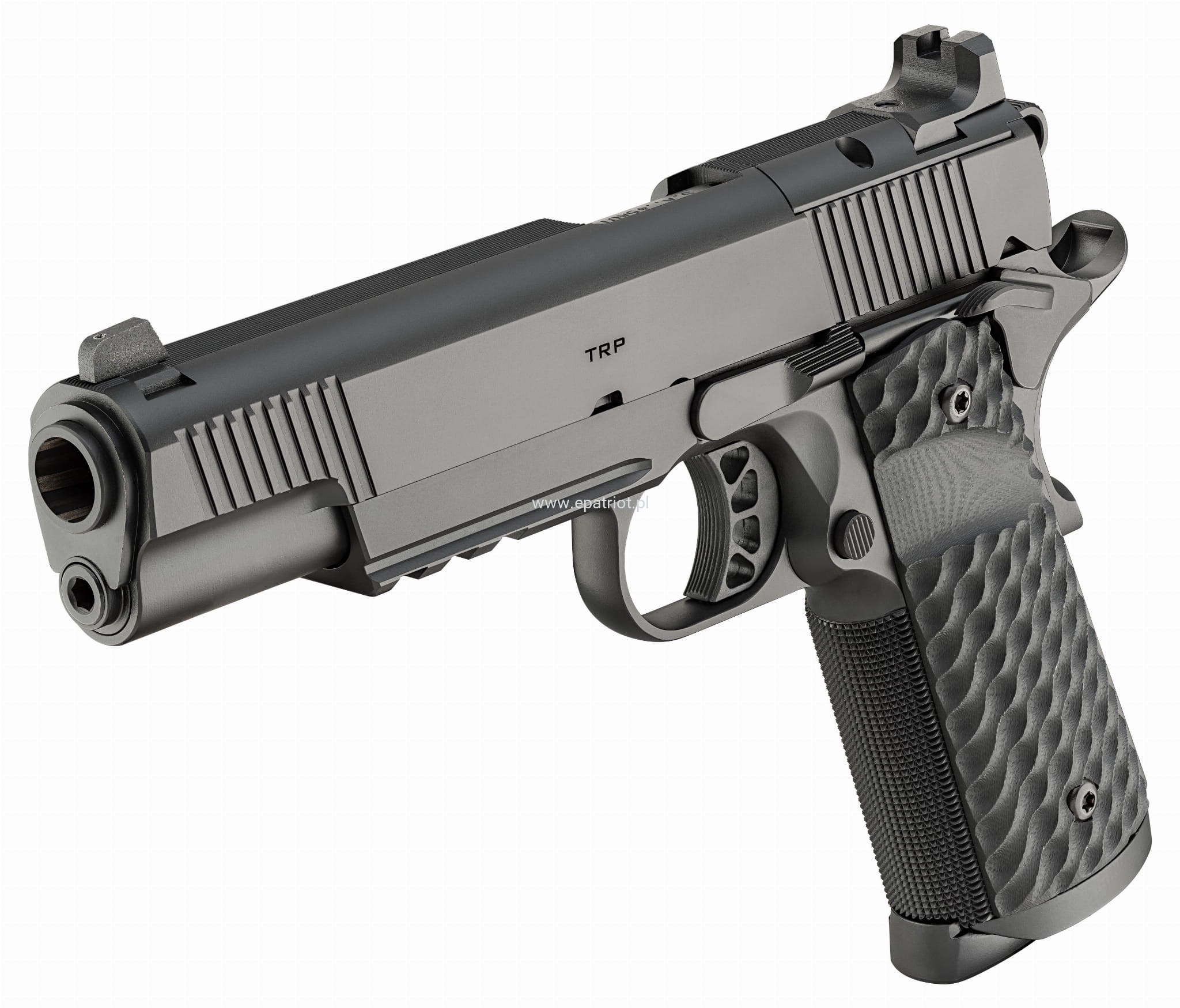 Pistolet Springfield 1911 TRP czarny kal. 9x19mm z 5-calową lufą oraz możliwością montażu kolimatora. Wykończony powłoką Black Cerakote, został zbudowany ze starannie dopasowanych ręcznie komponentów dla maksymalnej precyzji. W nowej wersji TRP został wyposażony w system Agency Optic System (AOS), który umożliwia montaż szerokiej gamy popularnych kolimatorów – w tym RMR, Shield, Delta Point Pro oraz Docter. Każda płytka AOS zawiera zintegrowane przyrządy mechaniczne w kolorze czarnym, które zapewniają odpowiednią wysokość optyki oraz czytelny obraz celowniczy, umożliwiając współpracę przyrządów mechanicznych z kolimatorem (co-witness) w niemal każdej konfiguracji.