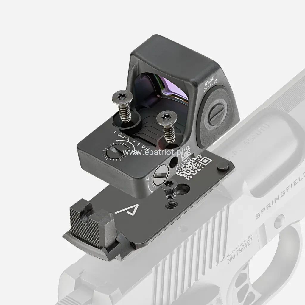 - Zamek z wycięciem pod kolimator (AOS) – system montażowy (Adapter Optics System) umożliwia szybką wymianę płytki pod różne typy optyki (w zestawie 1 płytka)