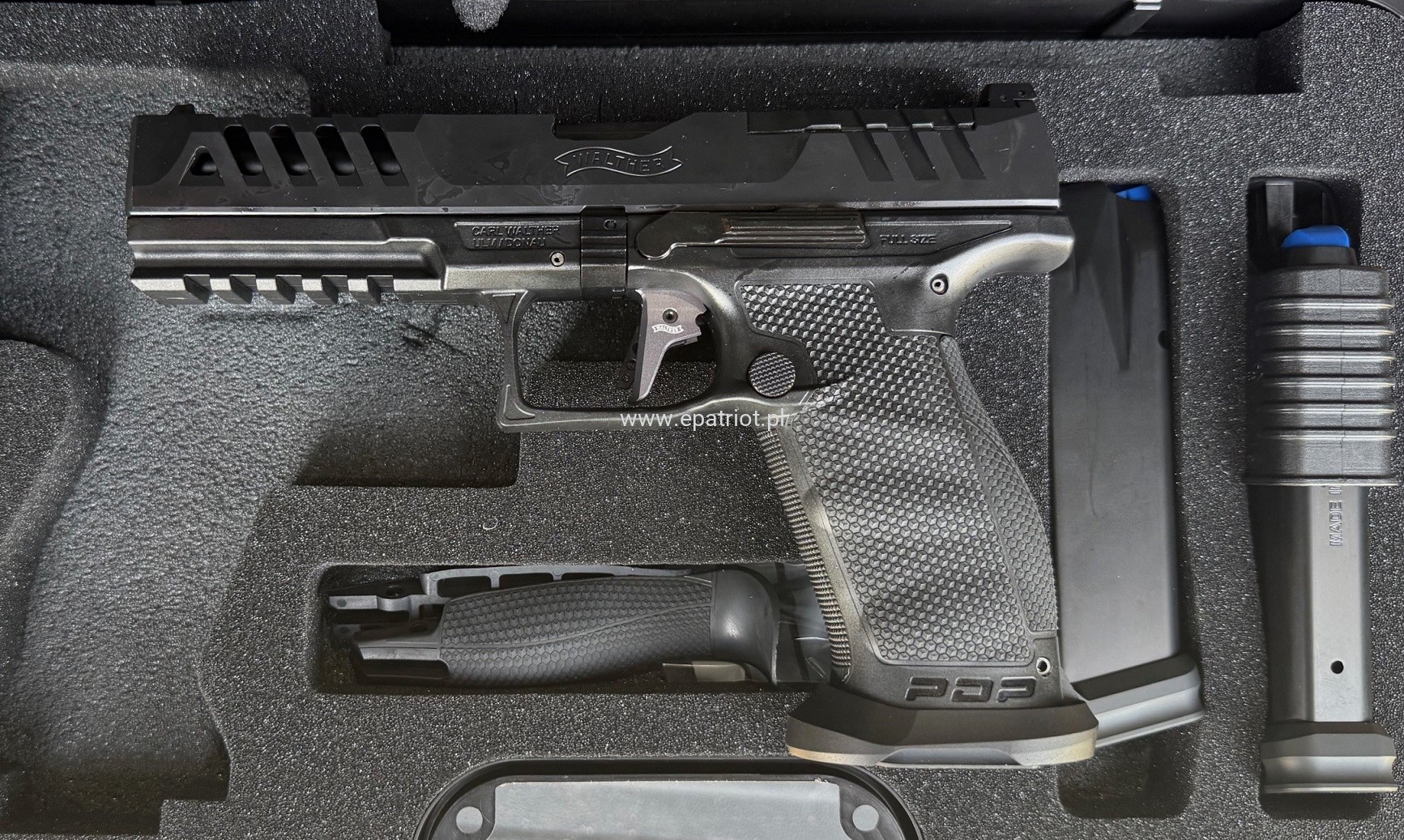 Pistolet Walther PDP FS Polymer Match lufa 5" to najdłuższa wersja z polimerowym chwytem, sportowym aluminiowym spustem Dynamic Performance Trigger, wyposażona w lejek (magwell) oraz precyzyjną lufę. To model przeznaczony do strzelectwa tarczowego i dynamicznego. Posiada doskonałą ergonomie chwytu, wymienne okładzin chwytu, nacięcia zarówno w przedniej jak i tylnej części zamka oraz sportowy system spustowy wykonany z aluminium, długą linię celowania, nacięcia odciążające zamek które zmniejszają wagę, możliwość montażu kolimatora oraz powiększone magazynki.