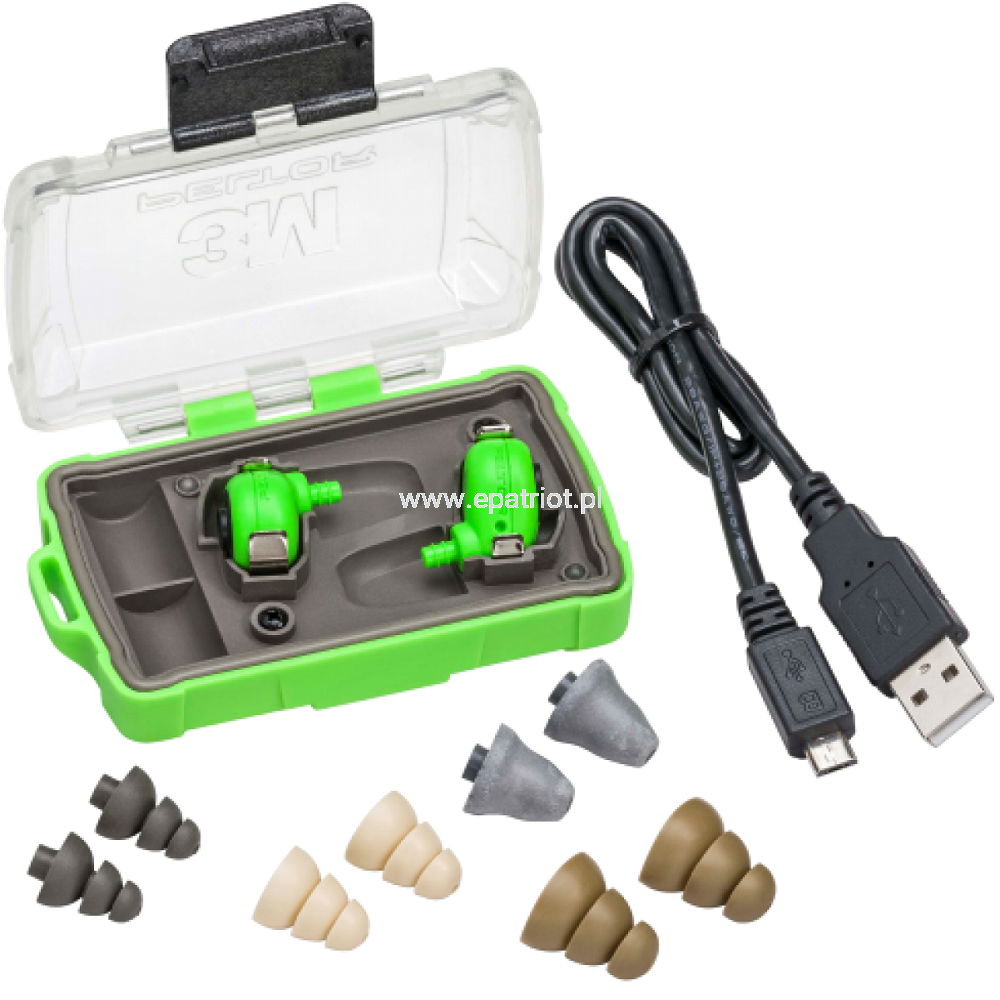 Wkładki przeciwhałasowe można ładować za pomocą portu USB na pojemniku. Pojemnik zapewnia także możliwość łatwego i wygodnego przechowywania wkładek, kiedy nie są używane. Mała i lekka konstrukcja poprawia ogólny komfort użytkowania, a także sprawia, że wkładki są kompatybilne z większością środków ochrony indywidualnej 3M do ochrony głowy, jak hełmy i osłony twarzy.