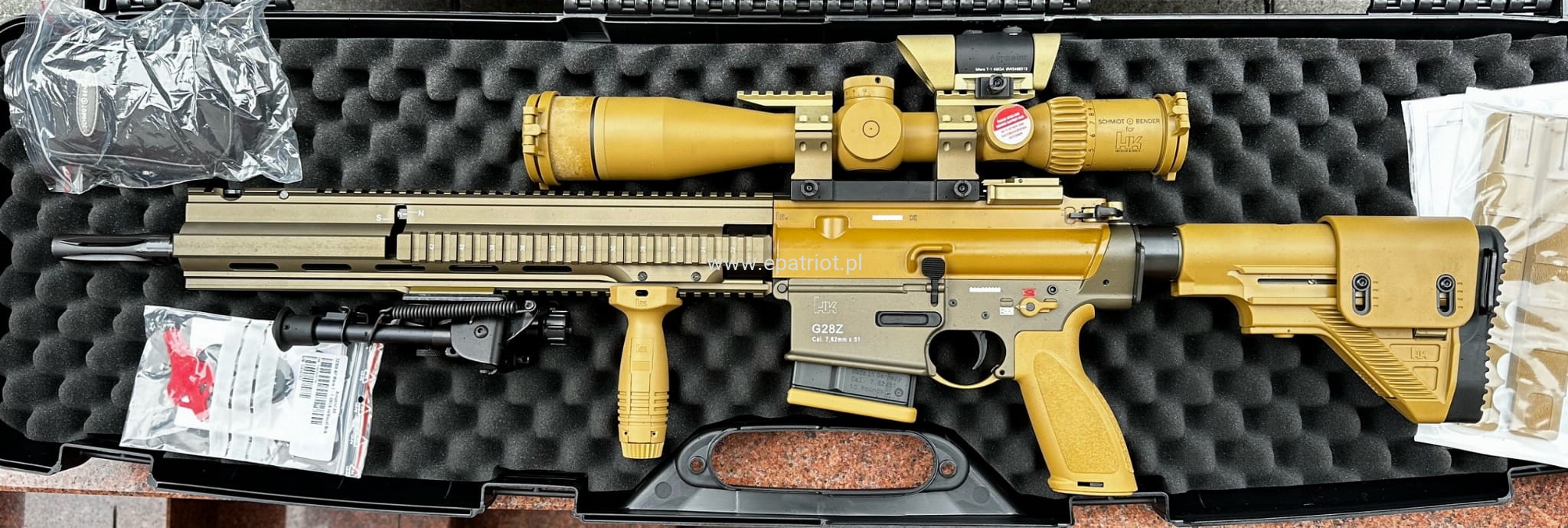 Zestaw Karabin HK G28-Z lufa 16,5" kal .308Win oryginalnie w zestawie z lunetą, kolimatorem, montażem, bipodem, chwytem oraz osłonami szyny. To wyjątkowa precyzyjna broń dla strzelców wyborowych. Posiada system tłokowy, wysokiej jakości mechaniczne przyrządy celownicze, regulowana snajperską kolbę z regulowaną baką oraz funkcjonalność oparta o standardową amunicję NATO. Gwarantowana wysoka jakość i niezawodność najlepszej niemieckiej firmy H&K.
